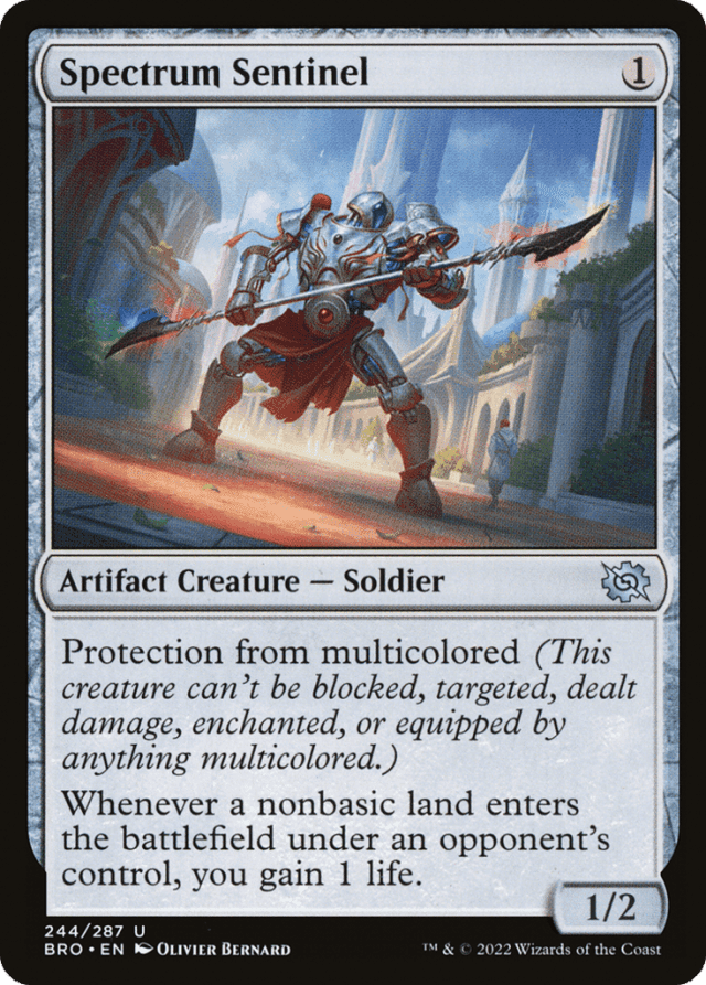 Protection from multicolored (This creature can't be blocked, targeted, dealt damage, enchanted, or equipped by anything multicolored.) Whenever a nonbasic land an opponent controls enters, you gain 1 life.