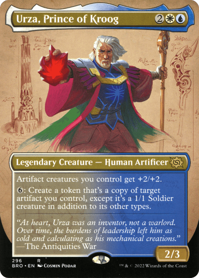 For Urza, Prince of Kroog's activated ability, the token copies exactly what was printed on the original permanent, with the listed exceptions, and nothing else (unless that permanent is copying something else or is a token; see below). It doesn't copy whether that permanent is tapped or untapped, whether it has any counters on it or Auras and Equipment attached to it, or any non-copy effects that have changed its power, toughness, types, color, or so on. — If the copied permanent has {X} in its mana cost, X is considered to be 0. — If the copied permanent is a token, the token created with Urza copies the original characteristics of that token as stated by the effect that created that token, with the listed exceptions. — If the copied permanent is copying something else, then the token enters the battlefield as whatever that permanent copied, with the listed exceptions. — The token is a Soldier creature in addition to its other types. Its base power and toughness is 1/1. These are the copiable values of the token's characteristics that other effects may copy.