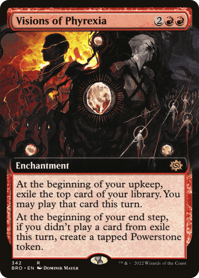 Although all the cards in The Brothers' War that create Powerstone tokens create a tapped Powerstone token, entering the battlefield tapped isn't part of the token's definition. Notably, if you create a token that is a copy of a Powerstone token, the token copy won't enter the battlefield tapped. — If the card you exiled with the first ability is an instant, you may play it during your end step after Visions of Phyrexia's last ability has already resolved and created a Powerstone token. We call this having your cake and compleating it too. — If you played a card from exile for any reason, the ability won't trigger, even if it wasn't the card you exiled with the first ability. — Powerstone tokens are a kind of predefined token. Each one has the artifact subtype "Powerstone" and the ability "{T}: Add {C}. This mana can't be spent to cast a nonartifact spell." — You can use the {C} added by a Powerstone token on anything that isn't a nonartifact spell. This includes paying costs to activate abilities of both artifact and nonartifact permanents, paying ward costs, and so on. — You must follow all normal timing rules for a card you play using Visions of Phyrexia's first ability and, if it's a spell, you must pay its costs to cast it.