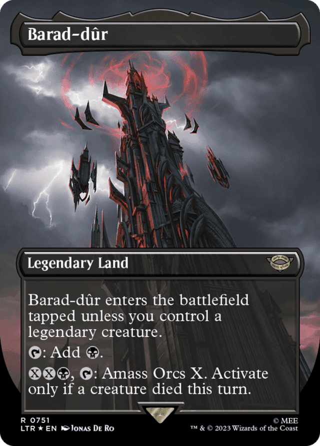 Barad-dûr enters tapped unless you control a legendary creature. {T}: Add {B}. {X}{X}{B}, {T}: Amass Orcs X. Activate only if a creature died this turn.