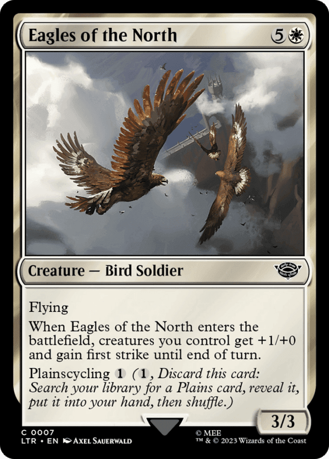 Eagles of the North's triggered ability affects only creatures you control at the time it resolves. Any creatures that come under your control later in the turn won't be affected. — Typecycling is a form of cycling. Any ability that triggers on a card being cycled also triggers on a card being typecycled. Any ability that stops a cycling ability from being activated also stops a typecycling ability from being activated. — Unlike the normal cycling ability, typecycling doesn't allow you to draw a card. Rather, it lets you search your library for a card with the type or types indicated by the ability name. For example, a card with basic landcycling lets you search for a basic land card, and a card with Wizardcycling lets you search for a Wizard card.