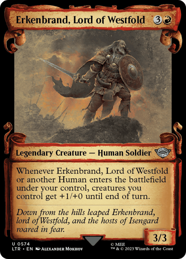 Whenever Erkenbrand or another Human you control enters, creatures you control get +1/+0 until end of turn.