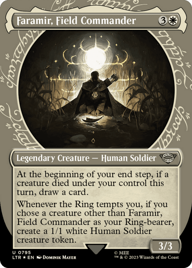 At the beginning of your end step, if a creature died under your control this turn, draw a card. Whenever the Ring tempts you, if you chose a creature other than Faramir as your Ring-bearer, create a 1/1 white Human Soldier creature token.