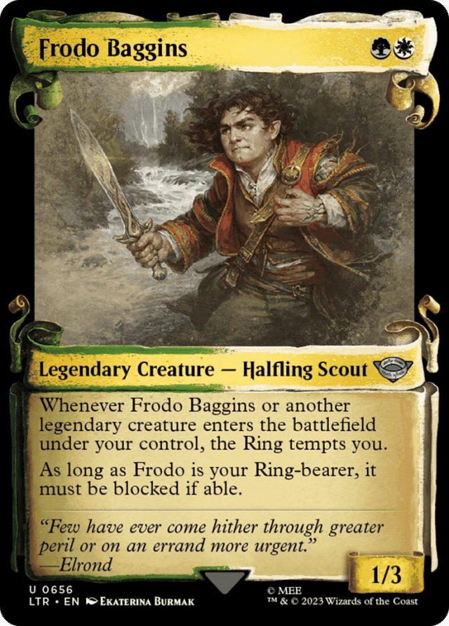 Whenever Frodo Baggins or another legendary creature you control enters, the Ring tempts you. As long as Frodo Baggins is your Ring-bearer, it must be blocked if able.