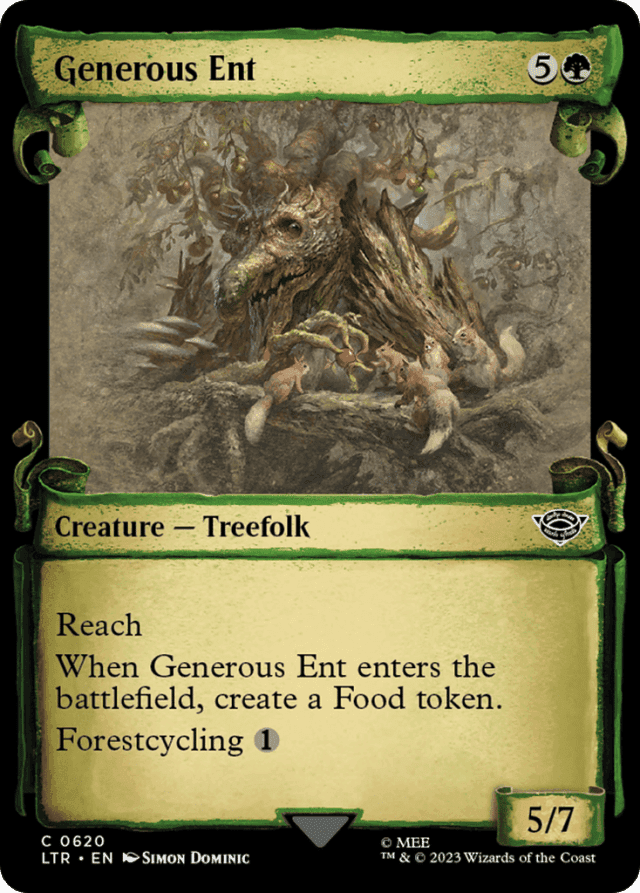 Reach When this creature enters, create a Food token. (It's an artifact with "{2}, {T}, Sacrifice this token: You gain 3 life.") Forestcycling {1} ({1}, Discard this card: Search your library for a Forest card, reveal it, put it into your hand, then shuffle.)