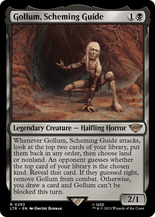 Whenever Gollum attacks, look at the top two cards of your library, put them back in any order, then choose land or nonland. An opponent guesses whether the top card of your library is the chosen kind. Reveal that card. If they guessed right, remove Gollum from combat. Otherwise, you draw a card and Gollum can't be blocked this turn.