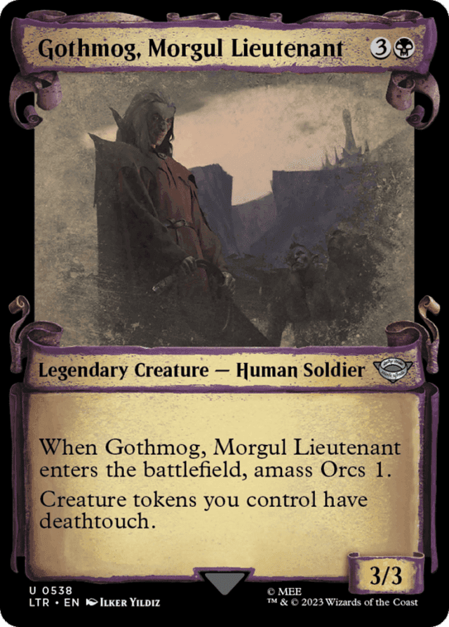 When Gothmog enters, amass Orcs 1. (Put a +1/+1 counter on an Army you control. It's also an Orc. If you don't control an Army, create a 0/0 black Orc Army creature token first.) Creature tokens you control have deathtouch.