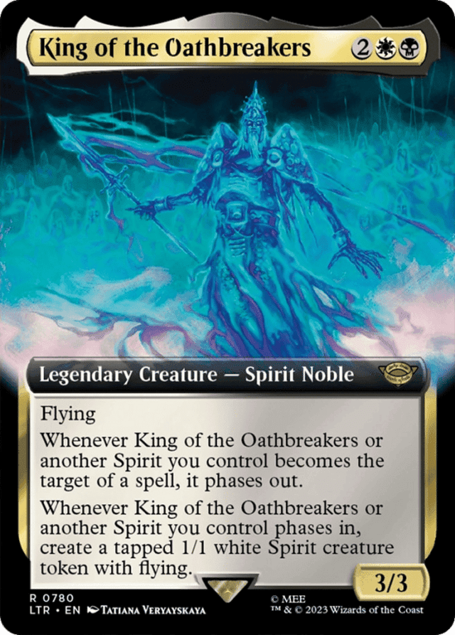 Flying Whenever King of the Oathbreakers or another Spirit you control becomes the target of a spell, it phases out. (Treat it and anything attached to it as though they don't exist until your next turn.) Whenever King of the Oathbreakers or another Spirit you control phases in, create a tapped 1/1 white Spirit creature token with flying.