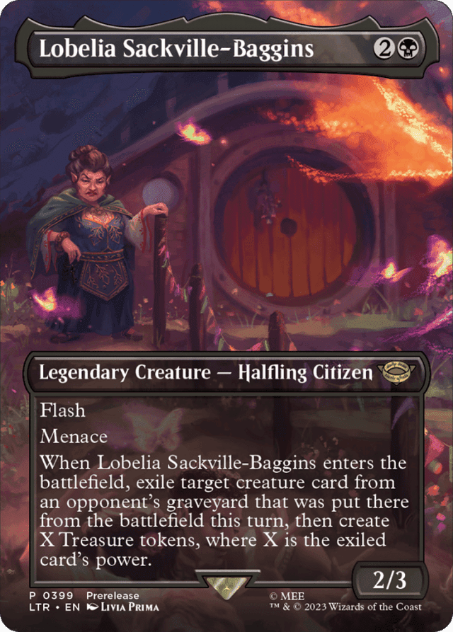 Flash Menace When Lobelia enters, exile target creature card from an opponent's graveyard that was put there from the battlefield this turn, then create X Treasure tokens, where X is the exiled card's power.