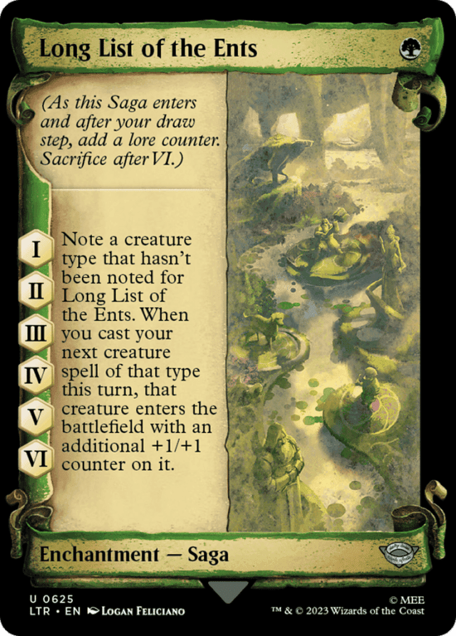 (As this Saga enters and after your draw step, add a lore counter. Sacrifice after VI.) I, II, III, IV, V, VI — Note a creature type that hasn't been noted for this Saga. When you next cast a creature spell of that type this turn, that creature enters with an additional +1/+1 counter on it.