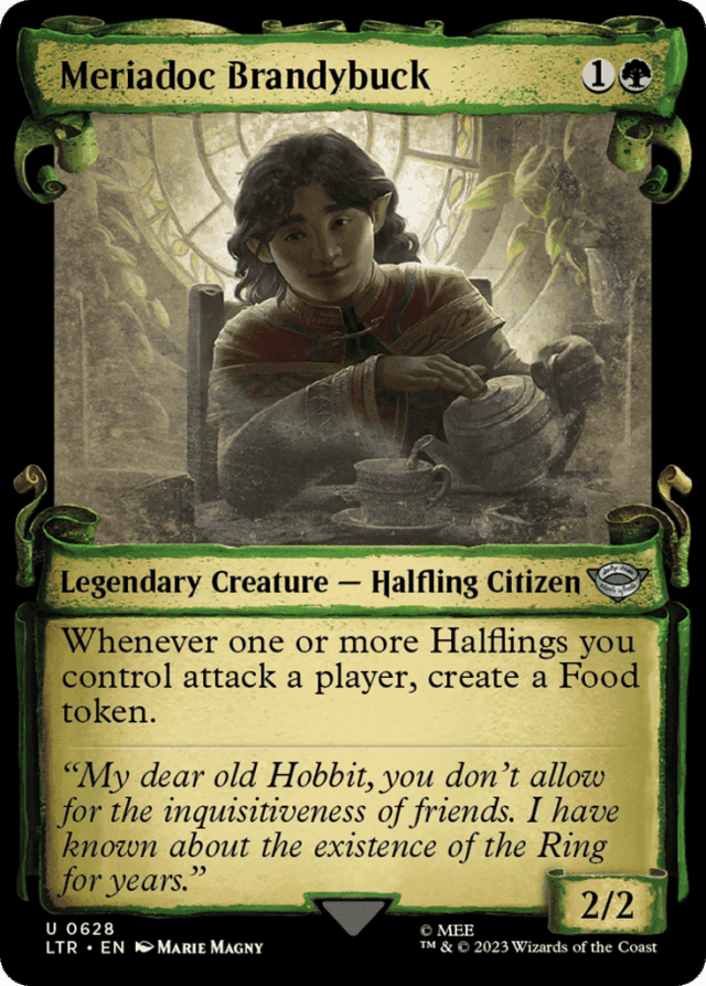 Halflings attacking a planeswalker or battle won't cause Meriadoc Brandybuck's ability to trigger. — Meriadoc Brandybuck's ability has you create just one Food token per player you attack with a Halfling, no matter how many Halflings you attack them with beyond the first. — Food is an artifact type. Even though it appears on some creatures, it's never a creature type. — Whatever you do, don't eat the delicious cards. — You can't sacrifice a Food to pay multiple costs. For example, you can't sacrifice a Food token to activate its own ability and also to activate Maraleaf Rider's ability.