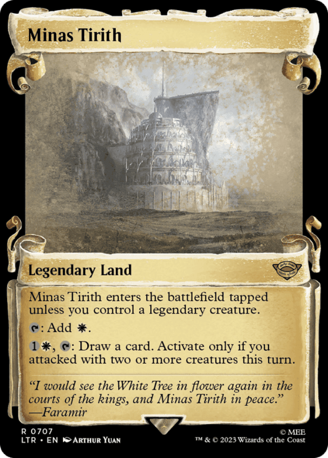 Minas Tirith enters tapped unless you control a legendary creature. {T}: Add {W}. {1}{W}, {T}: Draw a card. Activate only if you attacked with two or more creatures this turn.