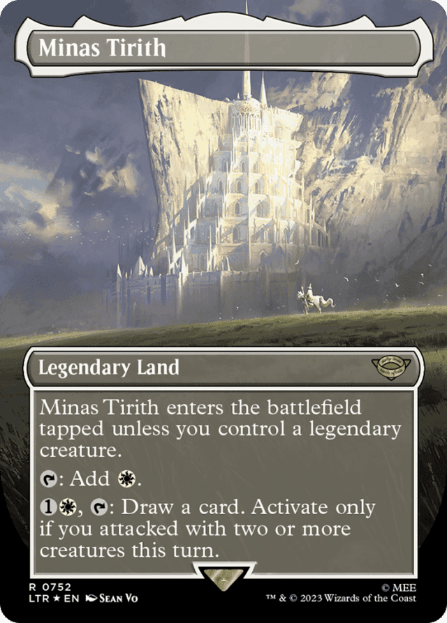 Minas Tirith enters tapped unless you control a legendary creature. {T}: Add {W}. {1}{W}, {T}: Draw a card. Activate only if you attacked with two or more creatures this turn.