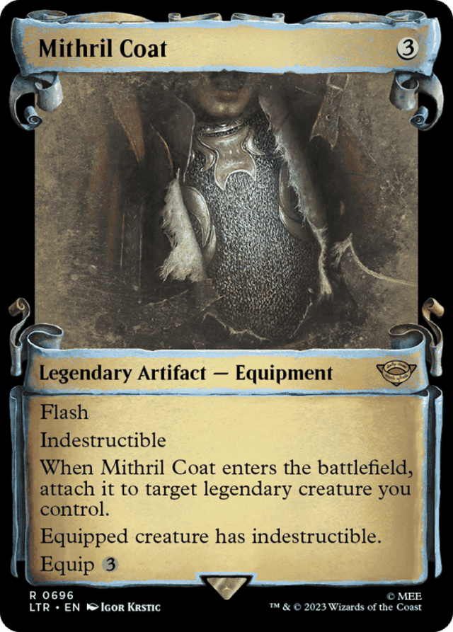 Flash Indestructible When Mithril Coat enters, attach it to target legendary creature you control. Equipped creature has indestructible. Equip {3}
