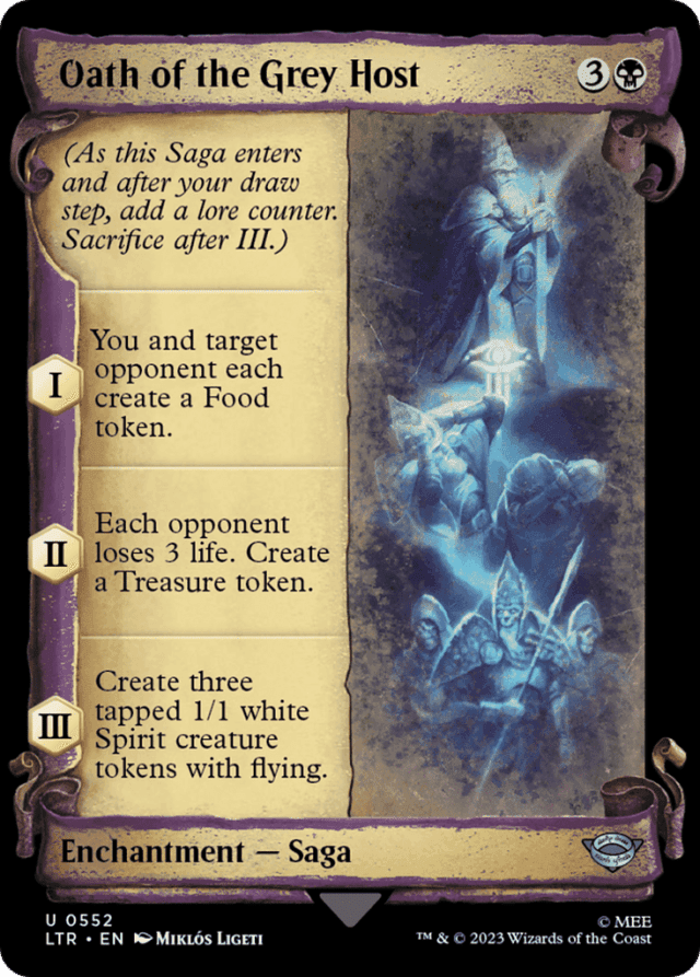 (As this Saga enters and after your draw step, add a lore counter. Sacrifice after III.) I — You and target opponent each create a Food token. II — Each opponent loses 3 life. Create a Treasure token. III — Create three tapped 1/1 white Spirit creature tokens with flying.