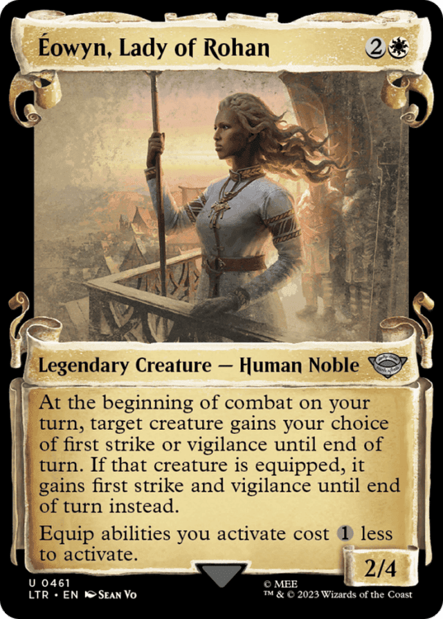 Some Equipment creature cards in other sets have reconfigure, a different ability that attaches them to a creature. Reconfigure is not an equip ability, and reconfigure costs are not reduced by Éowyn, Lady of Rohan's last ability. Equip variants or equip abilities with restrictions, like the "equip Human" ability of Dúnedain Blade, are still equip abilities, and their costs will be reduced by Éowyn, Lady of Rohan's last ability. — Éowyn, Lady of Rohan's last ability reduces only the amount of generic mana in equip abilities. For example, it will reduce an equip cost of {1} to {0}, but it will have no effect on an equip cost of {G}.