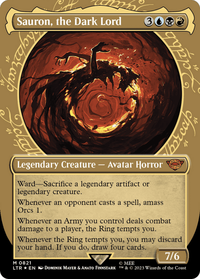 Ward—Sacrifice a legendary artifact or legendary creature. Whenever an opponent casts a spell, amass Orcs 1. Whenever an Army you control deals combat damage to a player, the Ring tempts you. Whenever the Ring tempts you, you may discard your hand. If you do, draw four cards.