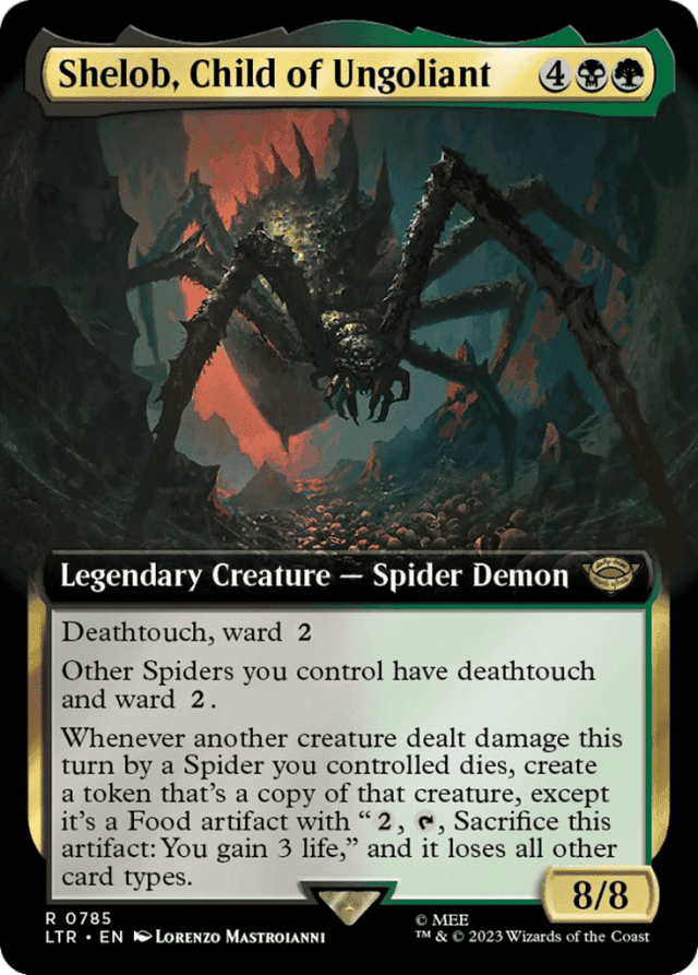 Deathtouch, ward {2} Other Spiders you control have deathtouch and ward {2}. Whenever another creature dealt damage this turn by a Spider you controlled dies, create a token that's a copy of that creature, except it's a Food artifact with "{2}, {T}, Sacrifice this token: You gain 3 life," and it loses all other card types.