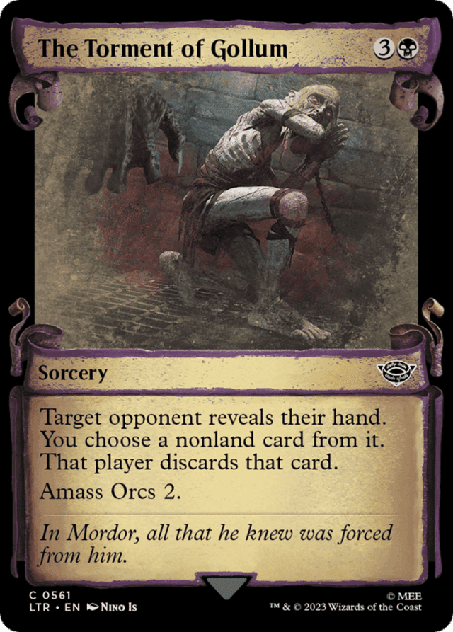 Target opponent reveals their hand. You choose a nonland card from it. That player discards that card. Amass Orcs 2. (Put two +1/+1 counters on an Army you control. It's also an Orc. If you don't control an Army, create a 0/0 black Orc Army creature token first.)