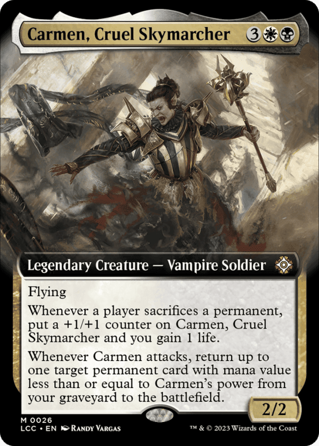 Flying Whenever a player sacrifices a permanent, put a +1/+1 counter on Carmen and you gain 1 life. Whenever Carmen attacks, return up to one target permanent card with mana value less than or equal to Carmen's power from your graveyard to the battlefield.