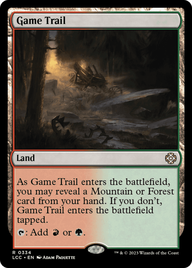 If a Mountain or Forest is entering the battlefield from your hand at the same time as Game Trail, you may reveal the other land to have Game Trail enter untapped. — If an effect instructs you to put Game Trail onto the battlefield tapped, it will still enter the battlefield tapped even if you reveal a land card from your hand. — Lands don't have a subtype just because they can produce mana of the corresponding color. Game Trail itself is neither a Mountain nor a Forest, even though it produces red and green mana, so you can't reveal one to satisfy the ability of another. — You may reveal any land card with either or both of the appropriate subtypes. It doesn't have to be a basic land. For example, you could reveal Canopy Vista from the Battle for Zendikar set to satisfy the ability of Game Trail.