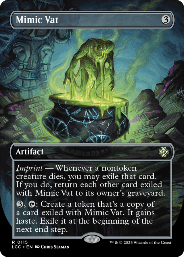 Any "enters" abilities of the exiled card will trigger when the token is put onto the battlefield. Any "as [this permanent] enters" or "[this permanent] enters with" abilities of the exiled card will also work. — Exiling the card as the first ability resolves is optional. If you choose not to exile it, or you can't exile it because the card has somehow left the graveyard before the ability resolves, the ability simply doesn't do anything as it resolves. Any card currently exiled by Mimic Vat remains exiled. — If Mimic Vat's second ability is activated during a turn's end step, the token will be exiled at the beginning of the following turn's end step. — If multiple nontoken creatures are put into their owners' graveyards from the battlefield at the same time, the imprint ability will trigger that many times. You put the triggered abilities on the stack in any order, so you'll determine in which order they resolve. However, since exiling those cards is optional, and choosing to exile a card this way causes the previously exiled cards to return to their owners' graveyards, the order generally doesn't matter: You'll wind up with at most one of those cards exiled, and the rest will be in the appropriate graveyards. — If the exiled card has {X} in its mana cost (such as Protean Hydra), X is considered to be 0. — If the token is a copy of a noncreature card, it will still have haste, though that won't matter unless that token somehow becomes a creature. — If the token isn't exiled when the delayed triggered ability resolves (due to Stifle, perhaps), it remains on the battlefield indefinitely. It continues to have haste. — The imprint ability will trigger whenever a nontoken creature is put into any graveyard from the battlefield, not just your graveyard. — The token created by the second ability will be a copy of whatever card is exiled with Mimic Vat at the time the ability resolves. This might not be the same card that was exiled with Mimic Vat at the time the ability was activated. It also might not be a creature card. — The token is exiled at the beginning of the next end step regardless of who controls it at that time, whether the exiled card is still exiled at that time, or whether Mimic Vat is still on the battlefield at that time. — You may activate the second ability even if no card has been exiled with Mimic Vat. If no card has been exiled with Mimic Vat by the time the ability resolves, no token will be created. — You may exile a noncreature card with Mimic Vat's first ability. For example, if a nontoken artifact that's become a creature is put into a graveyard from the battlefield, Mimic Vat's first ability triggers and you may exile that card. — If a melded permanent dies and triggers Mimic Vat's triggered ability, both of its component cards are exiled. As Mimic Vat's second ability resolves, its controller chooses one of those cards to make a token copy of. — If the creature that dies is an instant or sorcery card that's been manifested, Mimic Vat may have a nonpermanent card exiled. You can't create a token that's a copy of a nonpermanent card. No token is created in this case.