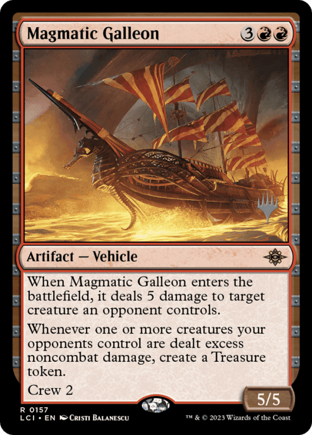 When this Vehicle enters, it deals 5 damage to target creature an opponent controls. Whenever one or more creatures your opponents control are dealt excess noncombat damage, create a Treasure token. Crew 2