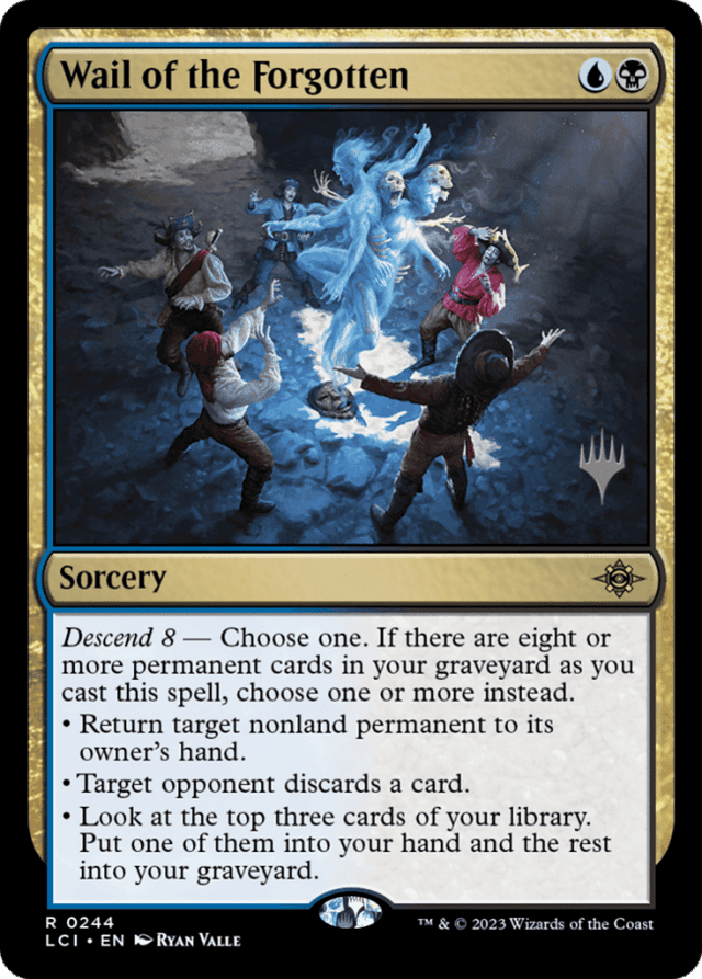 Cards with the ability word "descend N" have abilities that care if you have at least N permanent cards in your graveyard. — If all targets for the chosen modes become illegal before Wail of the Forgotten resolves, the spell will be countered and none of its effects will happen. If at least one target is still legal, the spell will resolve but will have no effect on any illegal targets. — Some descend triggered abilities include intervening "if" clauses (i.e. "if you have [four or eight] permanent cards in your graveyard" in the middle of the ability). Each of these abilities checks your graveyard at the moment it would trigger to see if it does. If you don't have the required number of permanent cards in your graveyard at that time, the ability doesn't trigger at all. If it does trigger, it will check again as it tries to resolve. If you don't have the required number of permanent cards in your graveyard at that time, the ability won't resolve and none of its effects will happen.