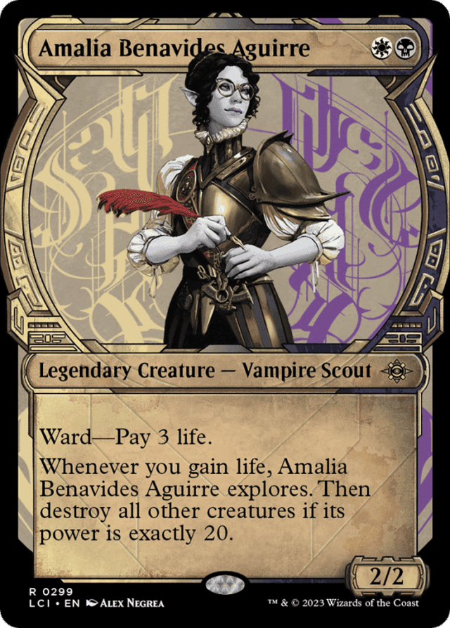 Ward—Pay 3 life. Whenever you gain life, Amalia Benavides Aguirre explores. Then destroy all other creatures if its power is exactly 20. (To have this creature explore, reveal the top card of your library. Put that card into your hand if it's a land. Otherwise, put a +1/+1 counter on this creature, then put the card back or put it into your graveyard.)