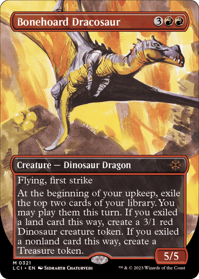 If you exile a land card and a nonland card, you'll create a Dinosaur token, then a Treasure token. — If you exile two land cards, you'll create only one Dinosaur token. Similarly, if you exile two nonland cards, you'll create only one Treasure token. — You pay all costs and follow all normal timing rules for cards played this way. For example, if one of the exiled cards is a land card, you may play it only during your main phase while the stack is empty.