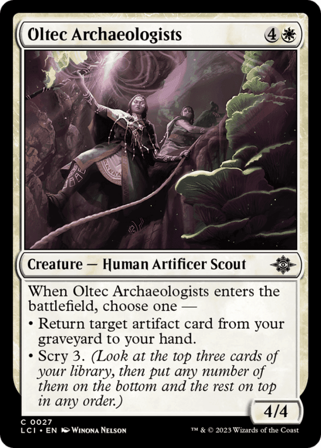 When this creature enters, choose one — • Return target artifact card from your graveyard to your hand. • Scry 3. (Look at the top three cards of your library, then put any number of them on the bottom and the rest on top in any order.)