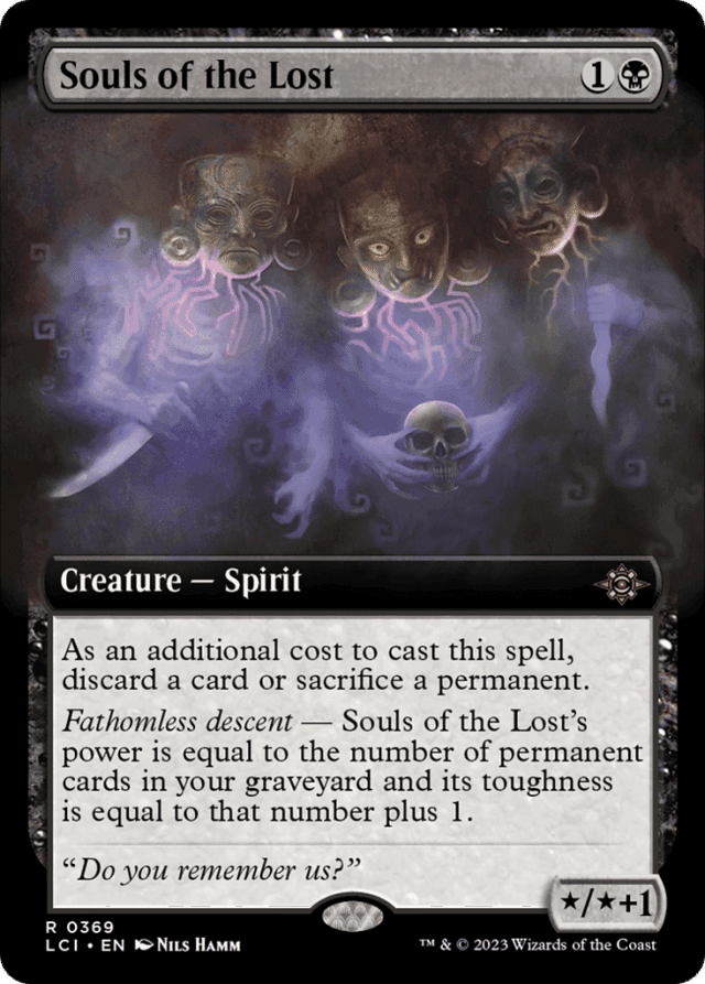 As an additional cost to cast this spell, discard a card or sacrifice a permanent. Fathomless descent — Souls of the Lost's power is equal to the number of permanent cards in your graveyard and its toughness is equal to that number plus 1.