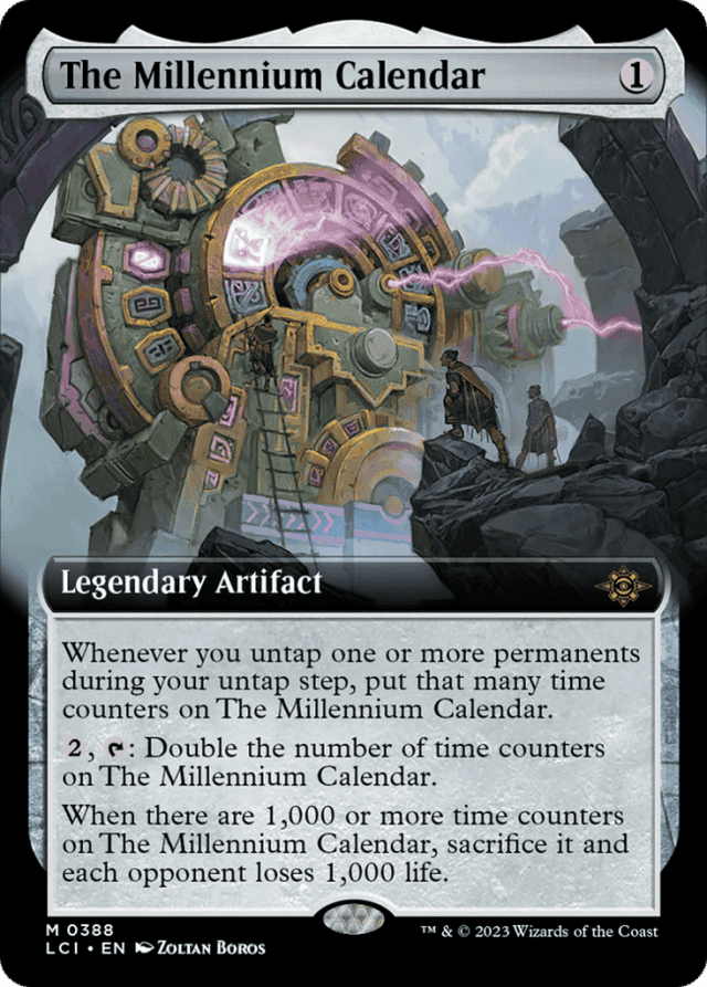 Whenever you untap one or more permanents during your untap step, put that many time counters on The Millennium Calendar. {2}, {T}: Double the number of time counters on The Millennium Calendar. When there are 1,000 or more time counters on The Millennium Calendar, sacrifice it and each opponent loses 1,000 life.