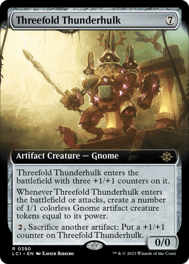If Threefold Thunderhulk leaves the battlefield while its triggered ability is on the stack, use its power as it last existed on the battlefield to determine how many Gnomes to create.