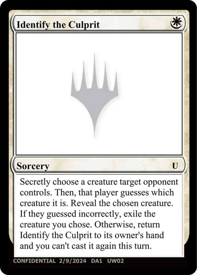 Secretly chose a creature target opponent controls. Then, that player guesses which creature it is. Reveal the chosen creature. If they guessed incorrectly, exile the creature you chose. Otherwise, return Identify the Culprit to its owner's hand and you can't cast it again this turn.
