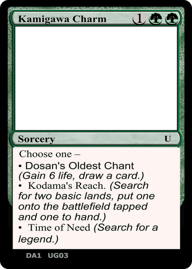 Choose one — • Dosan's Oldest Chant (Gain 6 life, draw a card.) • Kodama's Reach (Search for two basic lands, put one onto the battlefield tapped and one to hand.) • Time of Need (Search for a legend.)