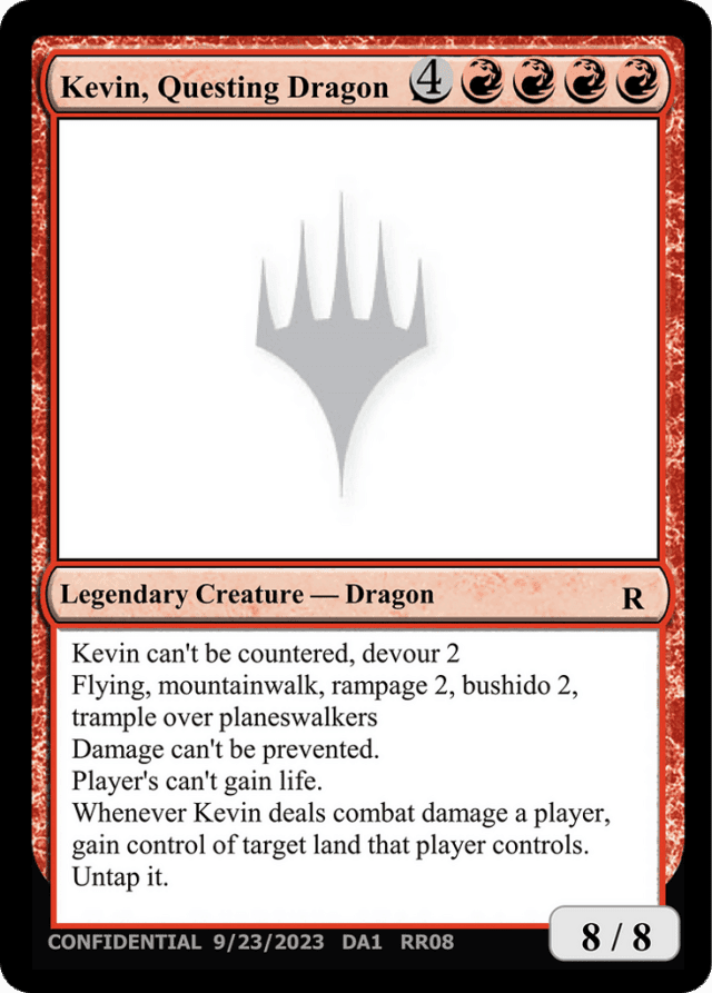 Kevin can't be countered, devour 2 Flying, mountainwalk, rampage 2, bushido 2, trample over planeswalkers Damage can't be prevented. Players can't gain life. Whenever Kevin deals combat damage to a player, gain control of target land that player controls. Untap it.