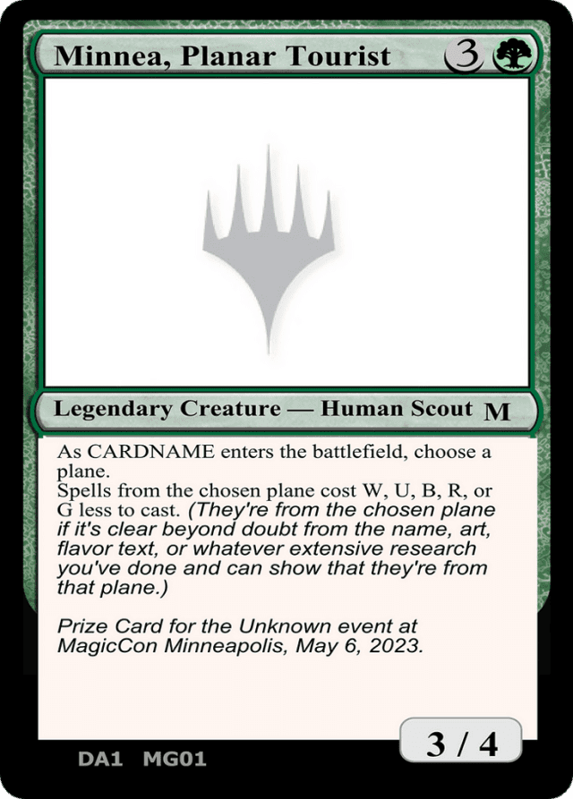 As Minnea, Planar Tourist enters the battlefield, choose a plane. Spells from the chosen plane cost {W}, {U}, {B}, {R}, or {G} less to cast. (They're from the chosen plane if it's clear beyond doubt from the name, art, flavor text, or whatever extensive research you've done and can show that they're from that plane.)