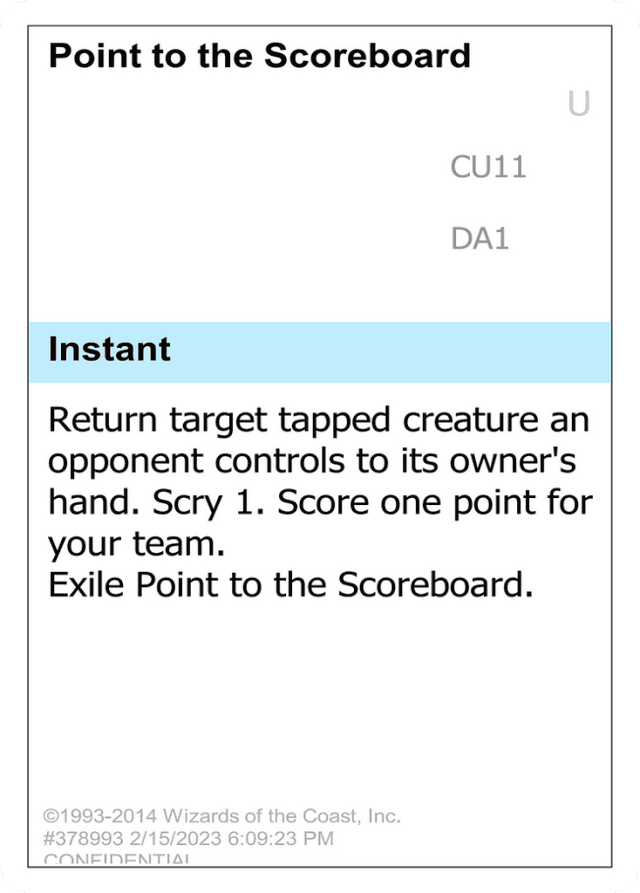 Return target tapped creature an opponent controls to its owner's hand. Scry 1. Score one point for your team. Exile Point to the Scoreboard.