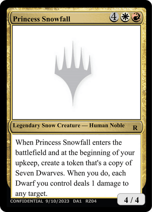 When Princess Snowfall enters the battlefield and at the beginning of your upkeep, create a token that's a copy of Seven Dwarves. When you do, each Dwarf you control deals 1 damage to any target.