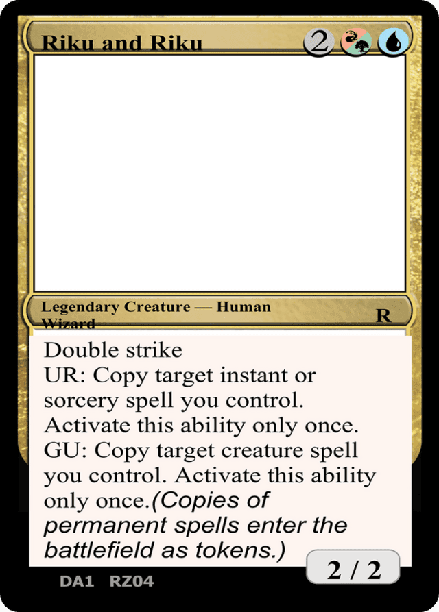 Double strike {U}{R}: Copy target instant or sorcery spell you control. Activate this ability only once. {G}{U}: Copy target creature spell you control. Activate this ability only once. (Copies of permanent spells enter the battlefield as tokens.)