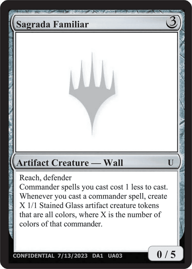 Reach, defender Commander spells you cast cost {1} less to cast. Whenever you cast a commander spell, create X 1/1 Stained Glass artifact creature tokens that are all colors, where X is the number of colors of that commander.