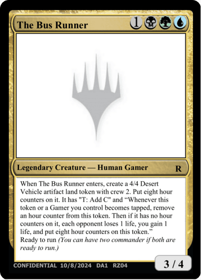 When The Bus Runner enters, create a 4/4 Desert Vehicle artifact land token with crew 2. Put eight hour counters on it. It has "{T}: Add {C}" and "Whenever this token or a Gamer you control becomes tapped, remove an hour counter from this token. Then if it has no hour counters on it, each opponent loses 1 life, you gain 1 life, and put eight hour counters on this token." Ready to run (You can have two commanders if both have ready to run.)