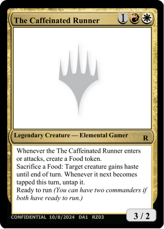 Whenever the The Caffeinated Runner enters or attacks, create a Food token. Sacrifice a Food: Target creature gains haste until end of turn. Whenever it next becomes tapped this turn, untap it. Ready to run (You can have two commanders if both have ready to run.)