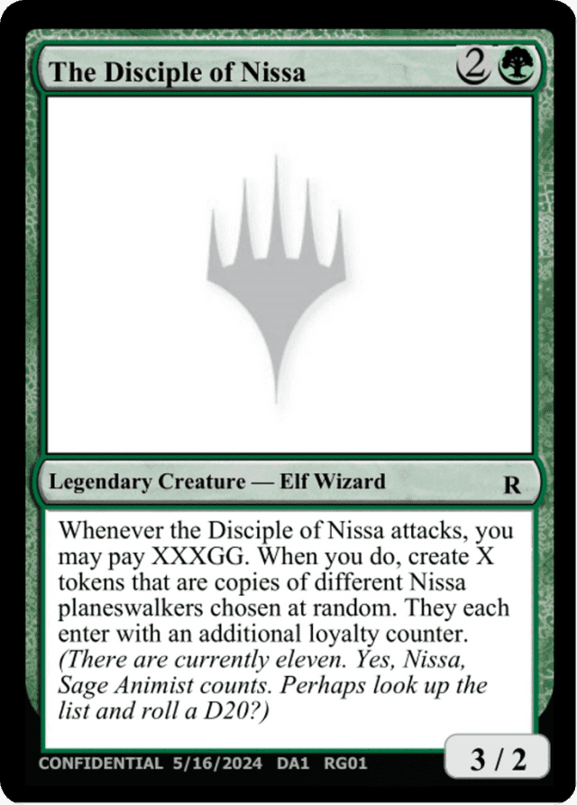 Whenever the Disciple of Nissa attacks, you may pay {X}{X}{X}{G}{G}. When you do, create X tokens that are copies of different Nissa planeswalkers chosen at random. They each enter with an additional loyalty counter. (There are currently eleven. Yes, Nissa, Sage Animist counts. Perhaps look up the list and roll a D20?)