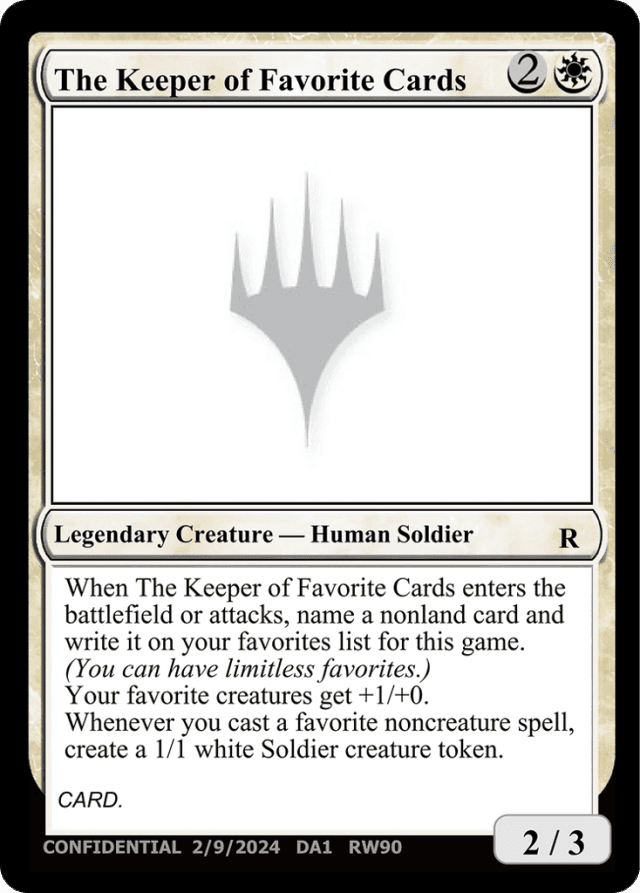 When The Keeper of Favorite Cards enters the battlefield or attacks, name a nonland card and write it on your favorites list for this game. (You can have limitless favorites.) Your favorite creatures get +1/+0. Whenever you cast a favorite noncreature spell, create a 1/1 white Soldier creature token.