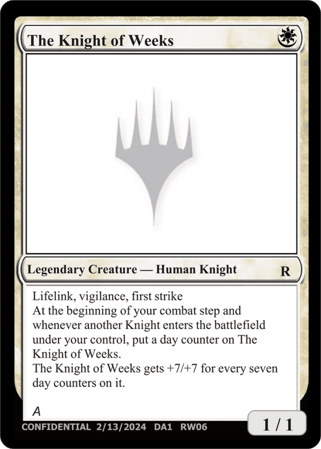 Lifelink, vigilance, first strike At the beginning of your combat step and whenever another Knight enters the battlefield under your control, put a day counter on The Knight of Weeks. The Knight of Weeks gets +7/+7 for every seven day counters on it.