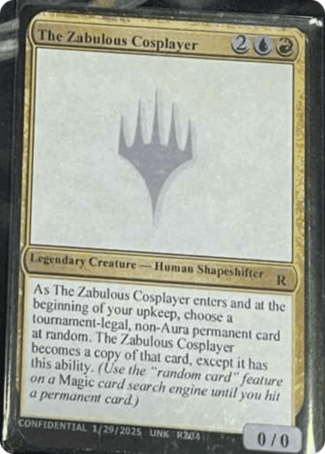 As The Zabulous Cosplayer enters and at the beginning of your upkeep, choose a tournament-legal non-Aura permanent card at random. The Zabulous Cosplayer becomes a copy of that card, except it has this ability. (Use the "random card" feature on a Magic card search engine until you hit a permanent card.)