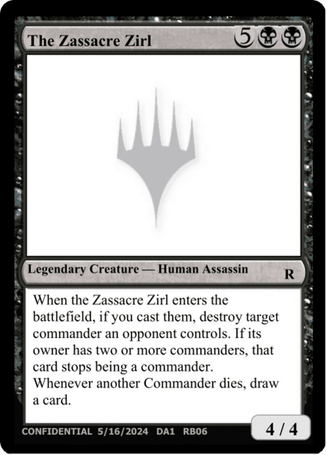When The Zassacre Zirl enters the battlefield, if you cast them, destroy target commander an opponent controls. If its owner has two or more commanders, that card stops being a commander. When another Commander dies, draw a card.