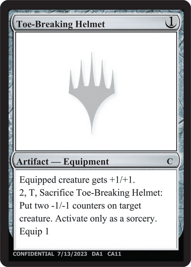 Equipped creature gets +1/+1. {2}, {T}, Sacrifice Toe-Breaking Helmet: Put two -1/-1 counters on target creature. Activate only as a sorcery. Equip {1}